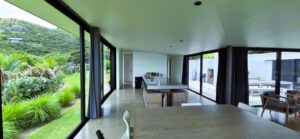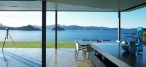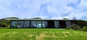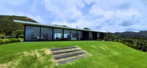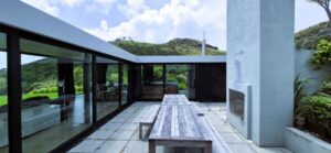 Designed by world-renowned architects Fearon~Hay, the multi-award winning 2000 square foot retreat is nestled protectively into the base of a hill by the sea. The glassy, minimalist one storey structure blends subtly into the surrounds while keeping you in close contact with the landscape. In calm weather the exterior walls slide completely open, removing any barrier between you and nature.