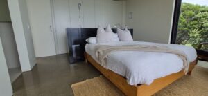 The house has four bedrooms, three with a queen-sized bed and one with a king-sized bed. Two bedrooms are situated next to the main living area each with their own ensuites, and two are in the separate guest wing accessed through the central courtyard.