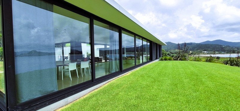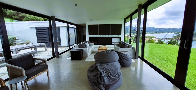 Designed by world-renowned architects Fearon~Hay, the multi-award winning 2000 square foot retreat is nestled protectively into the base of a hill by the sea. The glassy, minimalist one storey structure blends subtly into the surrounds while keeping you in close contact with the landscape. In calm weather the exterior walls slide completely open, removing any barrier between you and nature.