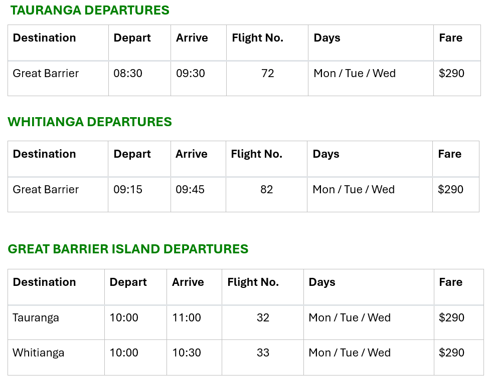 Flights from Whitianga, Tauranga & Whangarei